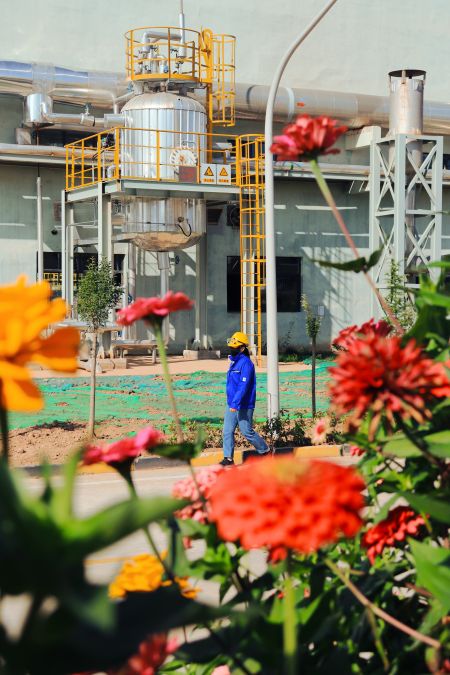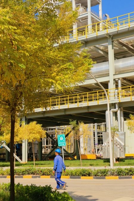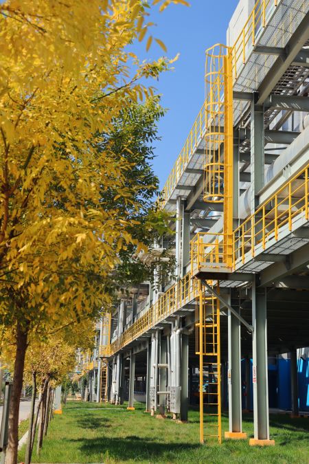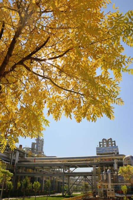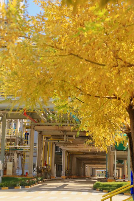“萬美之中秋為最”,秋不止在山村田野間路過,還停留在新民塬工業(yè)園區(qū)的每一處不起眼的角落里。漸漸泛黃的樹葉與銀白色的精餾塔形成鮮明的比照,愈發(fā)凸顯出藏在工業(yè)建筑里獨特的秋色;陽光從金黃的樹隙間透過,散發(fā)著耀眼的光芒;道路兩旁,幾株不知名的野花努力地挽留著詩情畫意的秋天;工業(yè)的“高冷”與秋天的“詩情畫意”在這片土地上實現(xiàn)完美的交融,這便是藏在彬州化工里的秋色。